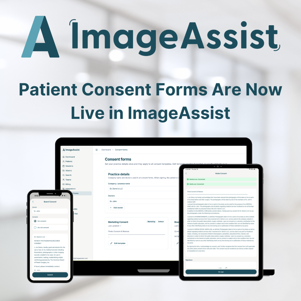 ImageAssist's new consent form feature lets clinicians capture patient signatures on iPhone or iPad in the exam room — with separate medical and marketing consent, automatic PDF storage, and instant visual indicators showing which patients are cleared for marketing use.