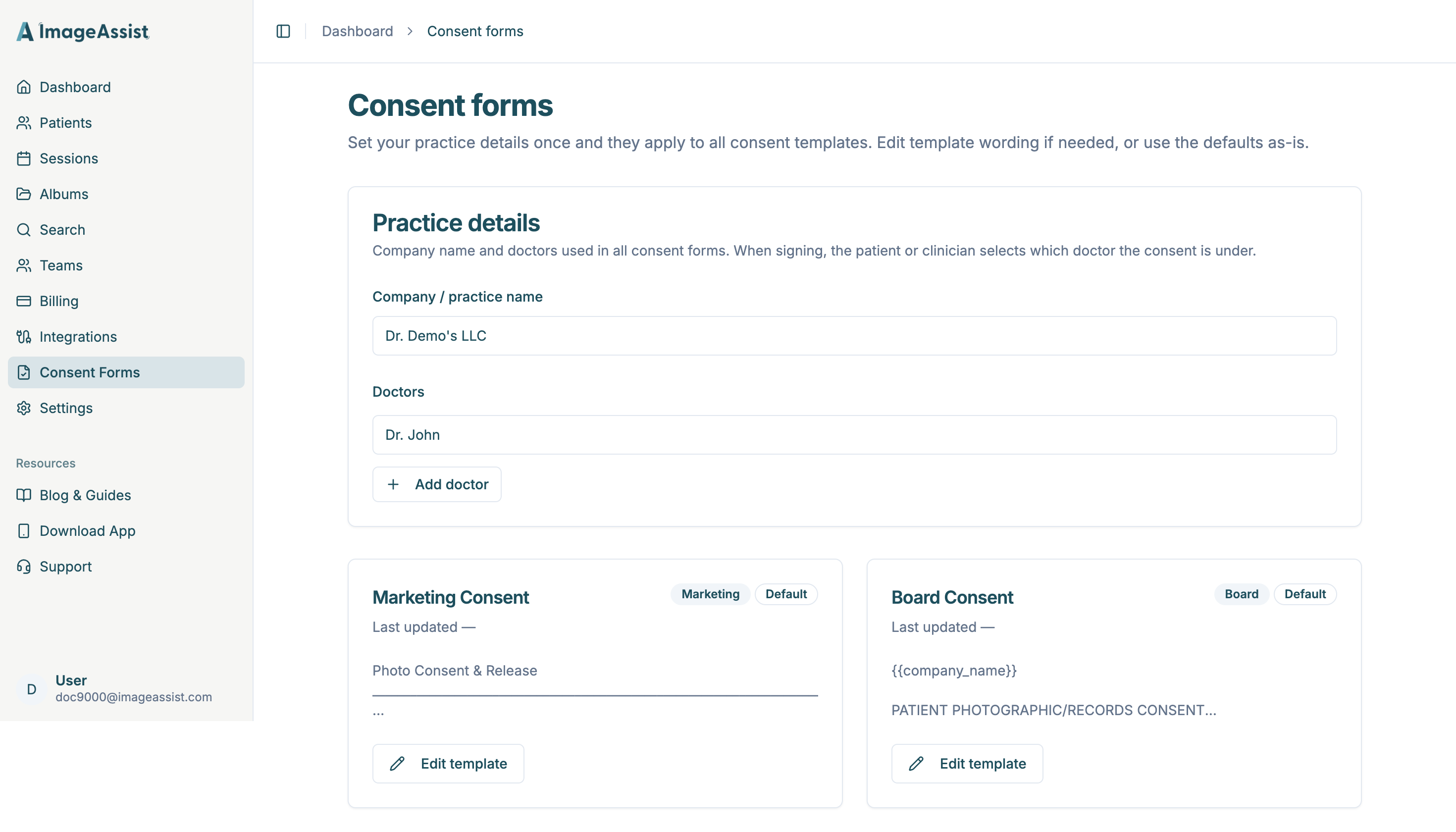 ImageAssist ships with a professional general consent template that's ready to use out of the box. But every practice is different. You can fully customize the form language, add your practice name and branding, or tailor the wording to match how your team communicates with patients — all from the ImageAssist web app.