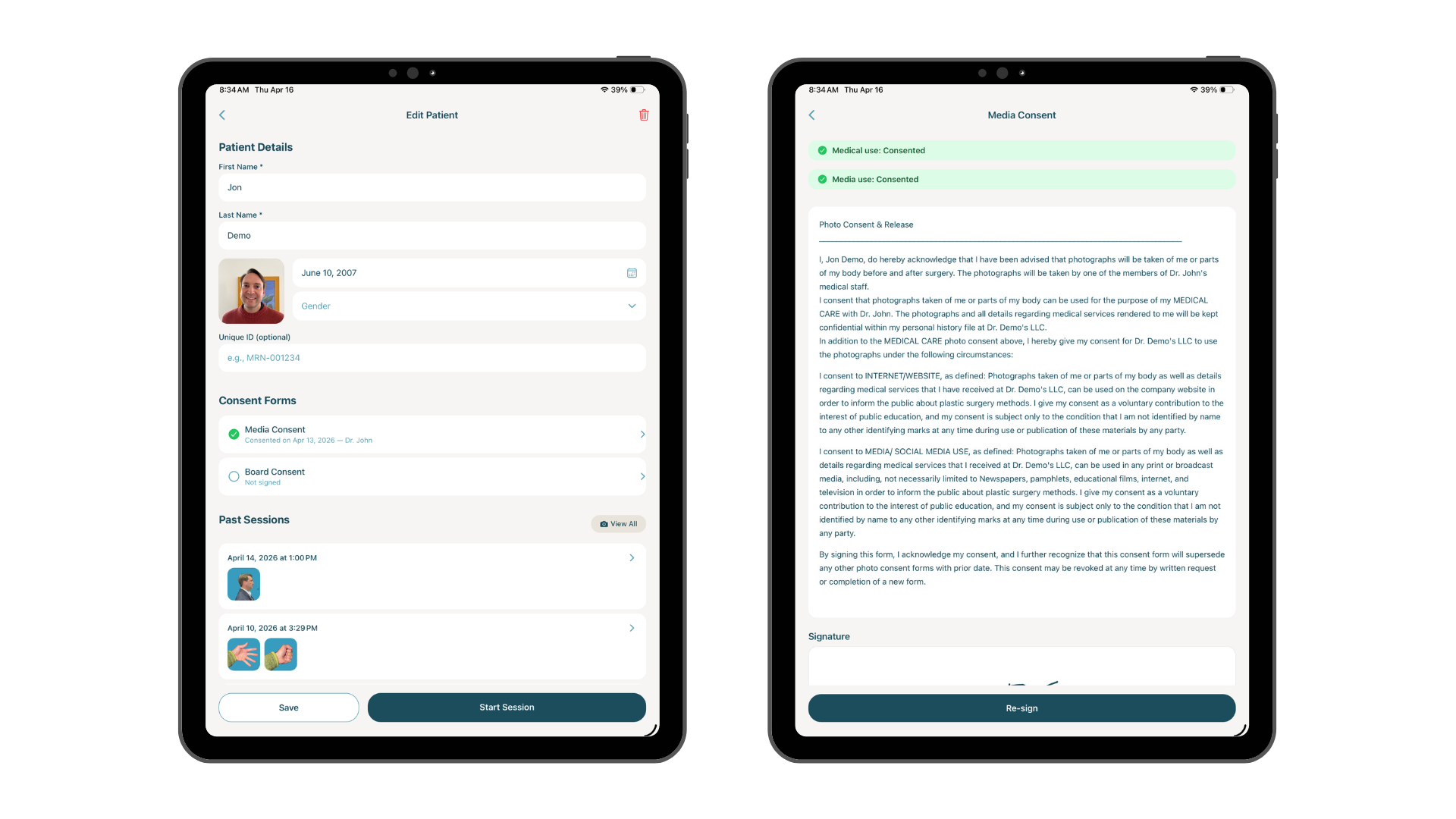 - Streamlined workflow — Consent happens in the exam room, in the same app, at the same moment as photo capture. No separate step, no extra friction.